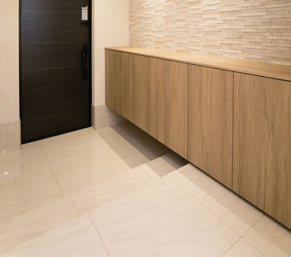 - 600角の磁器質大判タイルを玄関・1、2階廊下・DKに採用。優雅で洗練された表情が住まい全体に上質な雰囲気をもたらします。