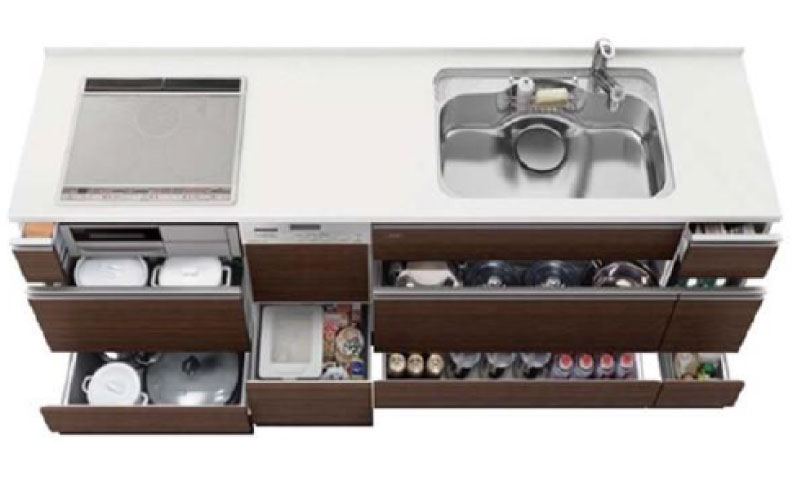 - 台輪スライド収納を装備したオールスライドキャビネット。台輪部と上部のスライド収納、3段スライドキャビネットと合わせて大容量の収納スペースを確保しています。
