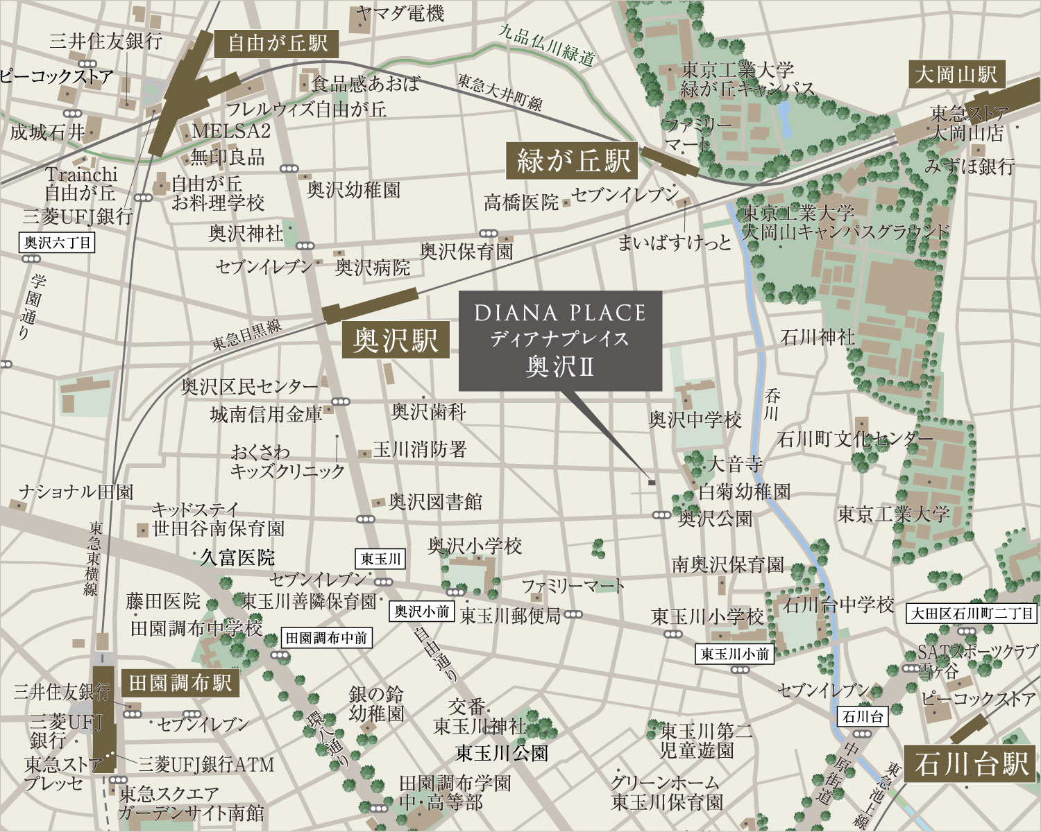 - 東急大井町線「緑が丘」駅徒歩8分、東急目黒線「奥沢」駅徒歩10分、東急池上線「石川台」駅徒歩12分