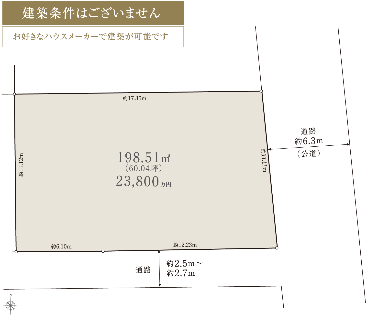 - 東側道路幅員約6.3m(公道)、南側幅員約2.5m〜2.7m(通路)