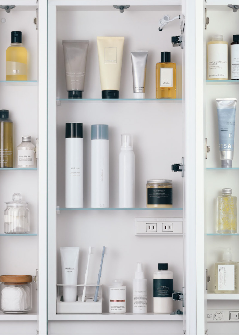 - モダンでシャープな空間を演出したパウダールーム。洗面化粧台は機能的な収納を豊富に備えた仕様。面材には、表面硬度が高く、キズも付きにくく耐久性に優れたメラミン化粧板を使用。使い勝手の良い木製ボックス仕様の三面鏡を設置。清潔感あふれるクリスタルホワイトのアクリル人造大理石フラットカウンターは汚れに強く、衝撃にも強さを発揮します。