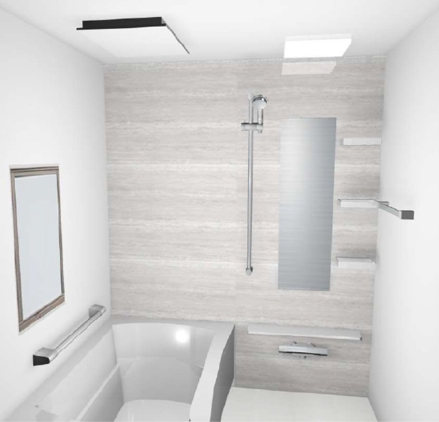 - 清潔感あふれるホワイトを基調とした天井。フラット形状なので水滴もつきにくくお掃除もラクラクです。※照明は異ります。