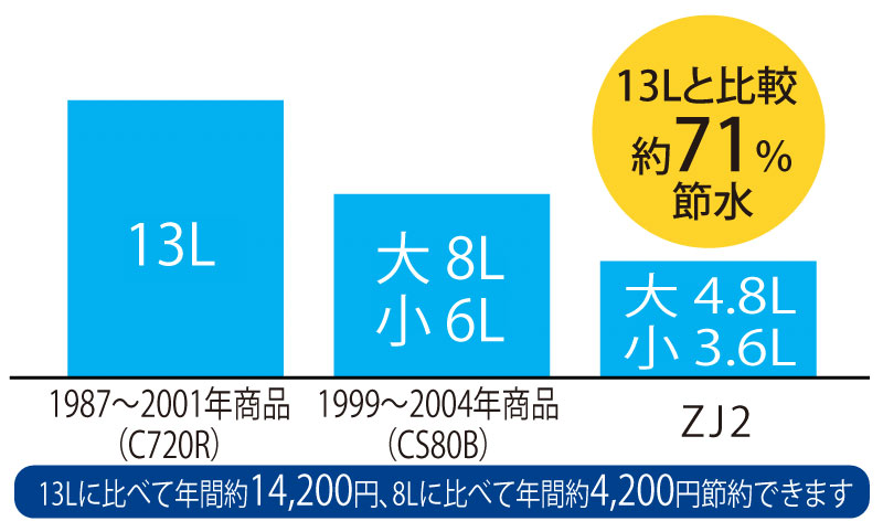 - 少ない水でしっかり洗浄。13L便器からおよそ1/3、普段どおり使っているだけでいつの間にか節水できます。