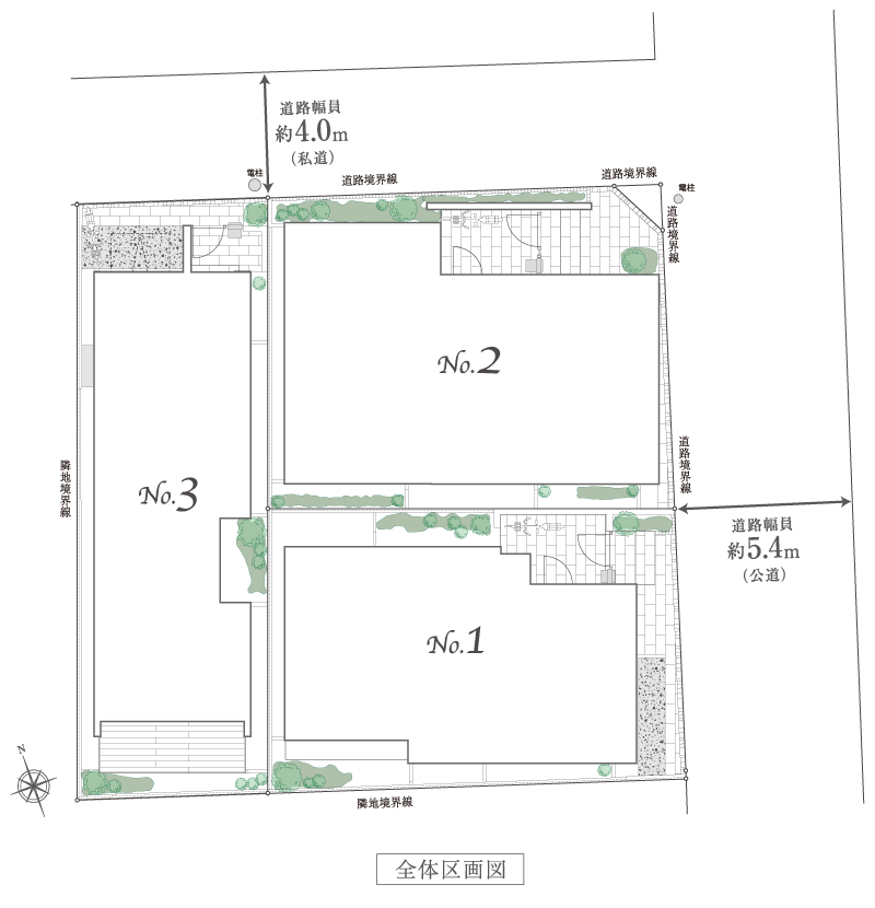 - 東側道路幅員約5.4m(公道)、北側道路幅員約4.0m(私道)
