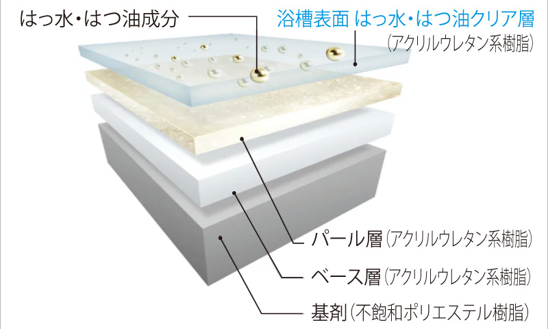 - はっ水・はつ油クリア層に覆われた浴槽表面は、水も皮脂も弾いて落としやすくします。