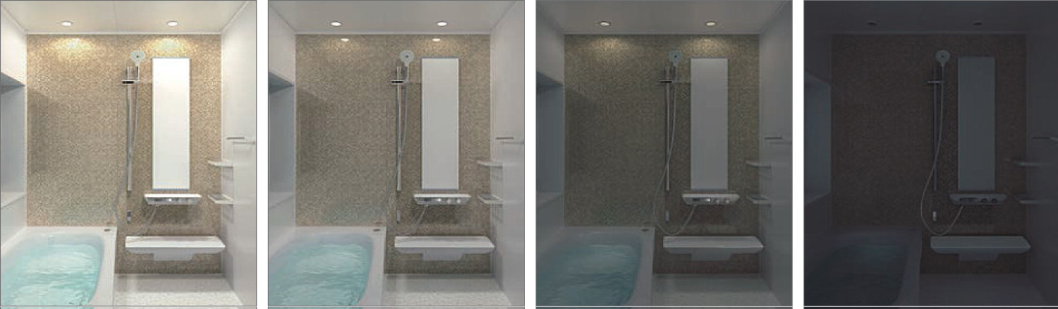 - ダウンライト(LED)の明るさをその時の気分や、お好みにあわせてリモコンで調節できる調光システムを搭載。バスタイムをさらに快適に、リラックスできる空間づくりをお楽しみいただけます。