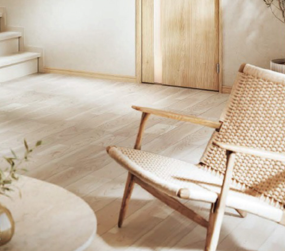 - 床材には、天然素材の暖かさを醸し出す突板フローリングを採用。表面に天然突板を施すことで木本来の素材感をお楽しみいただけます。汚れやキズにも強くキズ美しさを長く保ちます。