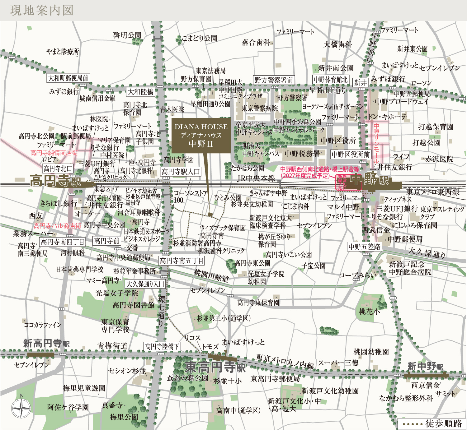 JR中央・総武線(東京メトロ東西線相互直通)2駅利用可、「高円寺」駅徒歩9分、「中野」駅徒歩11分。