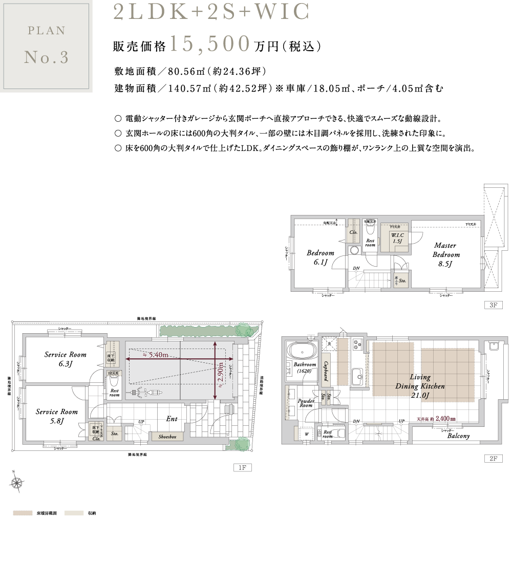 - 3号棟:140.57㎡(約42.52坪)※車庫面積18.05㎡、ポーチ面積4.05㎡含む
