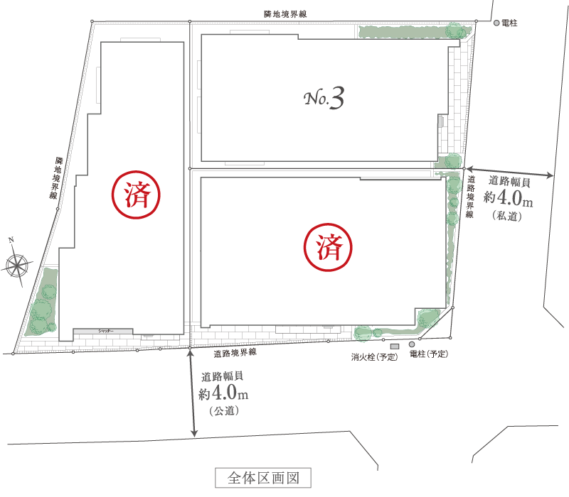 - 南側道路幅員約4.0m(公道)・東側道路幅員約4.0m(私道)