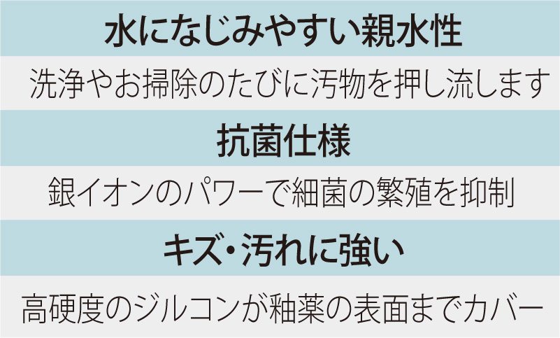 - 表面にキズが付きにくく、ISOに準拠した抗菌(銀イオン)パワーで細菌の繁殖も抑えられる、汚れに強い便器素材です。