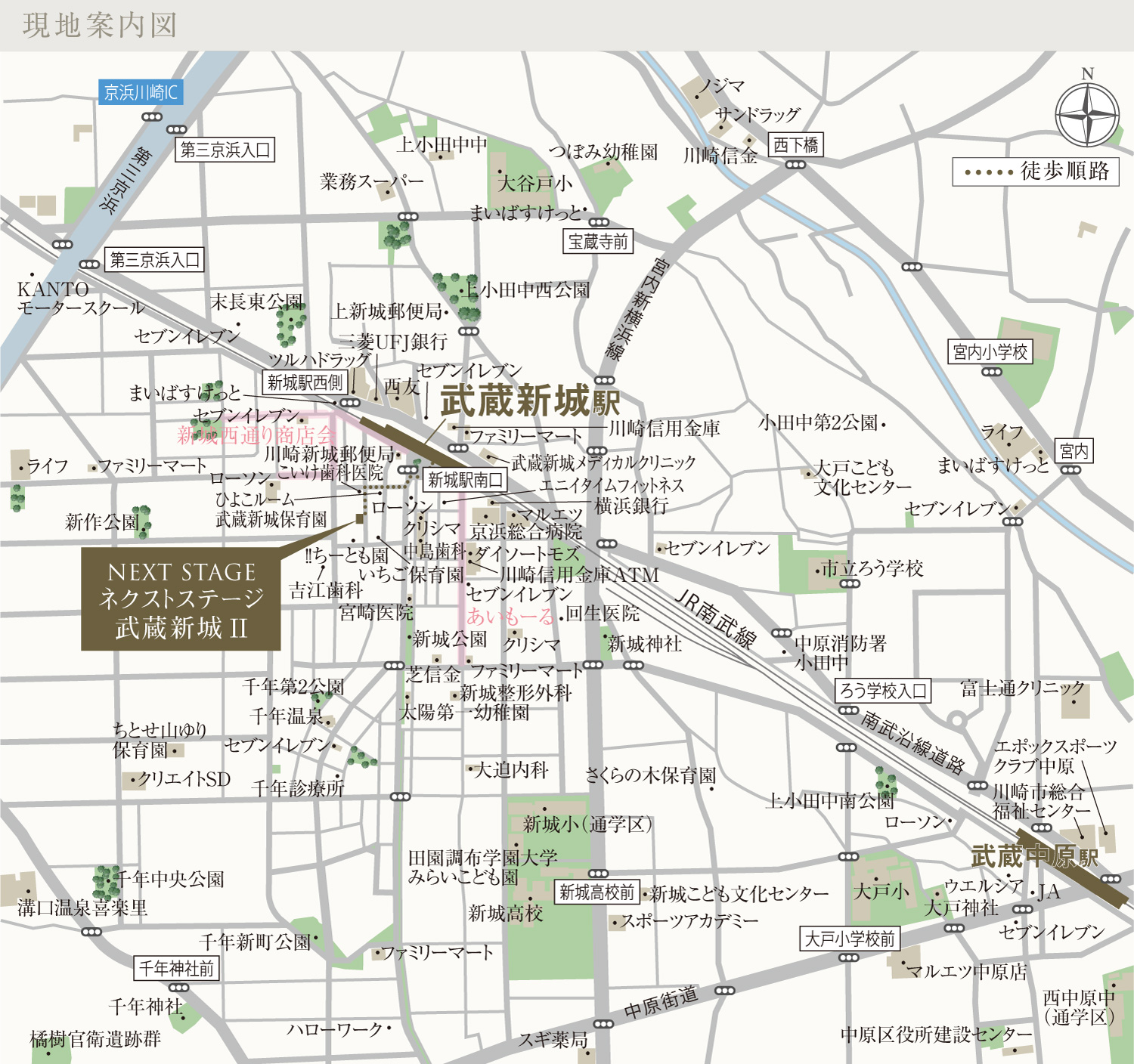 徒歩3分のJR南武線「武蔵新城」から都心方面へ、横浜方面へ軽快にアクセス。