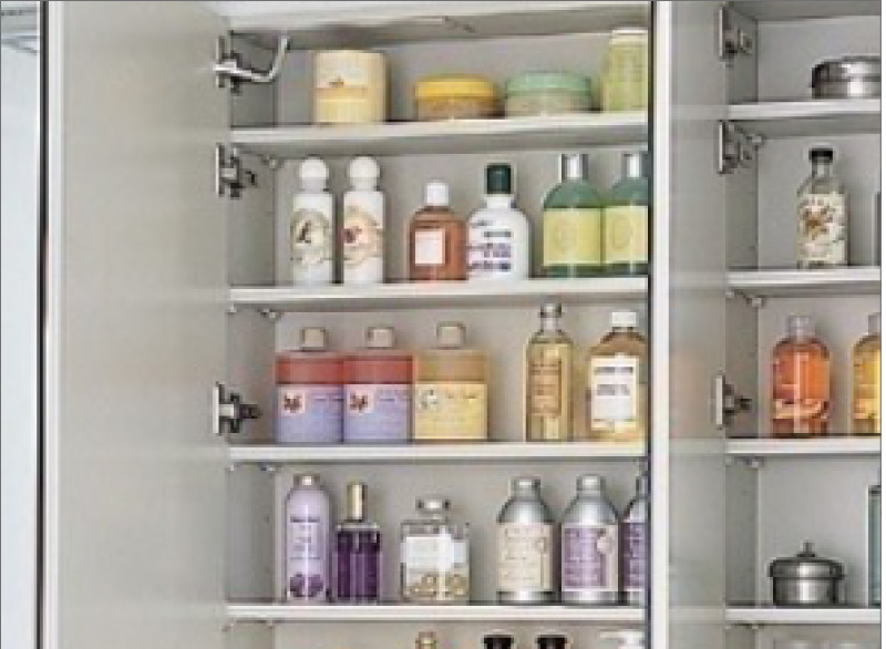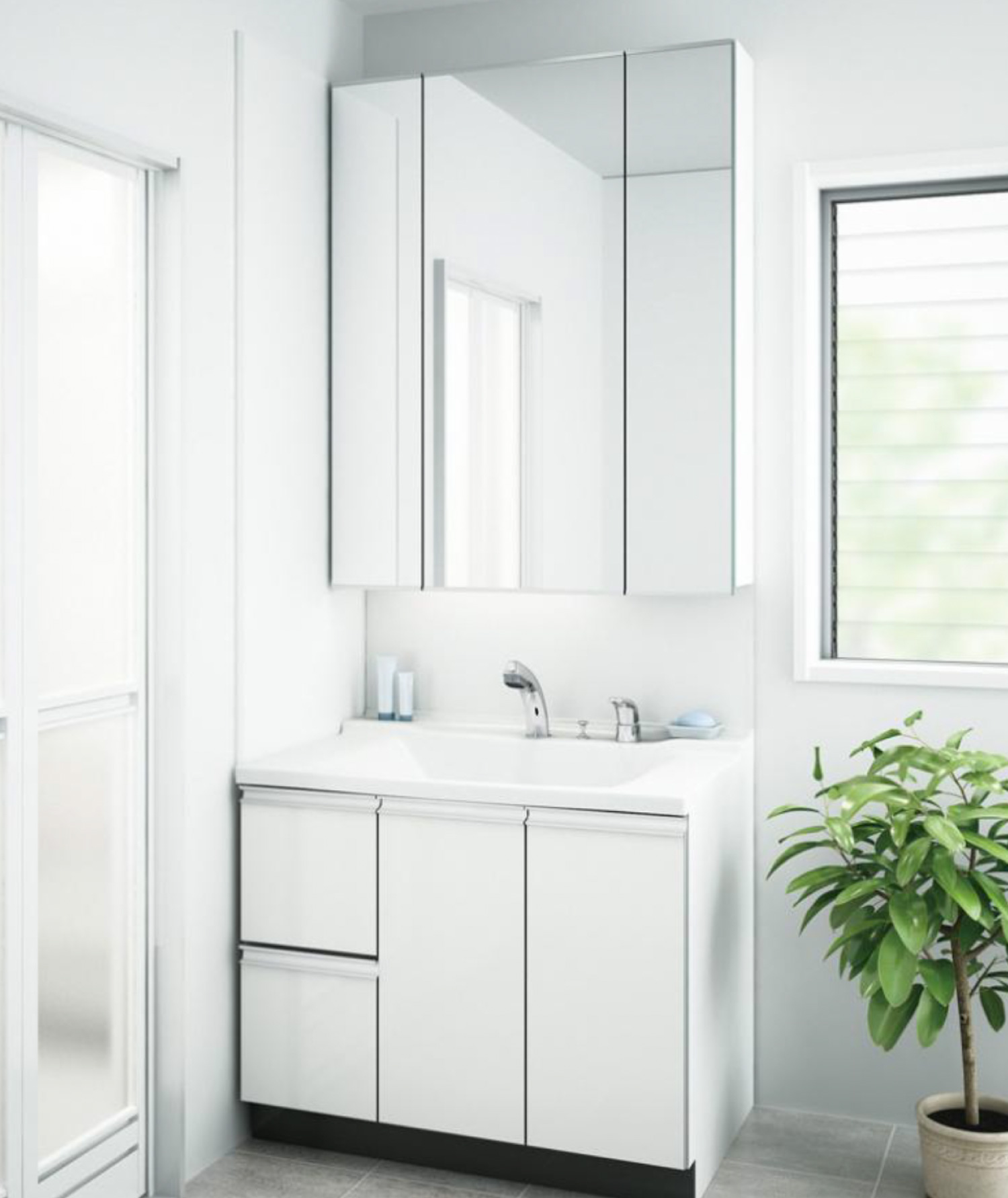 - 洗面化粧台の3面鏡裏には木製ボックス仕様の収納庫を設置。