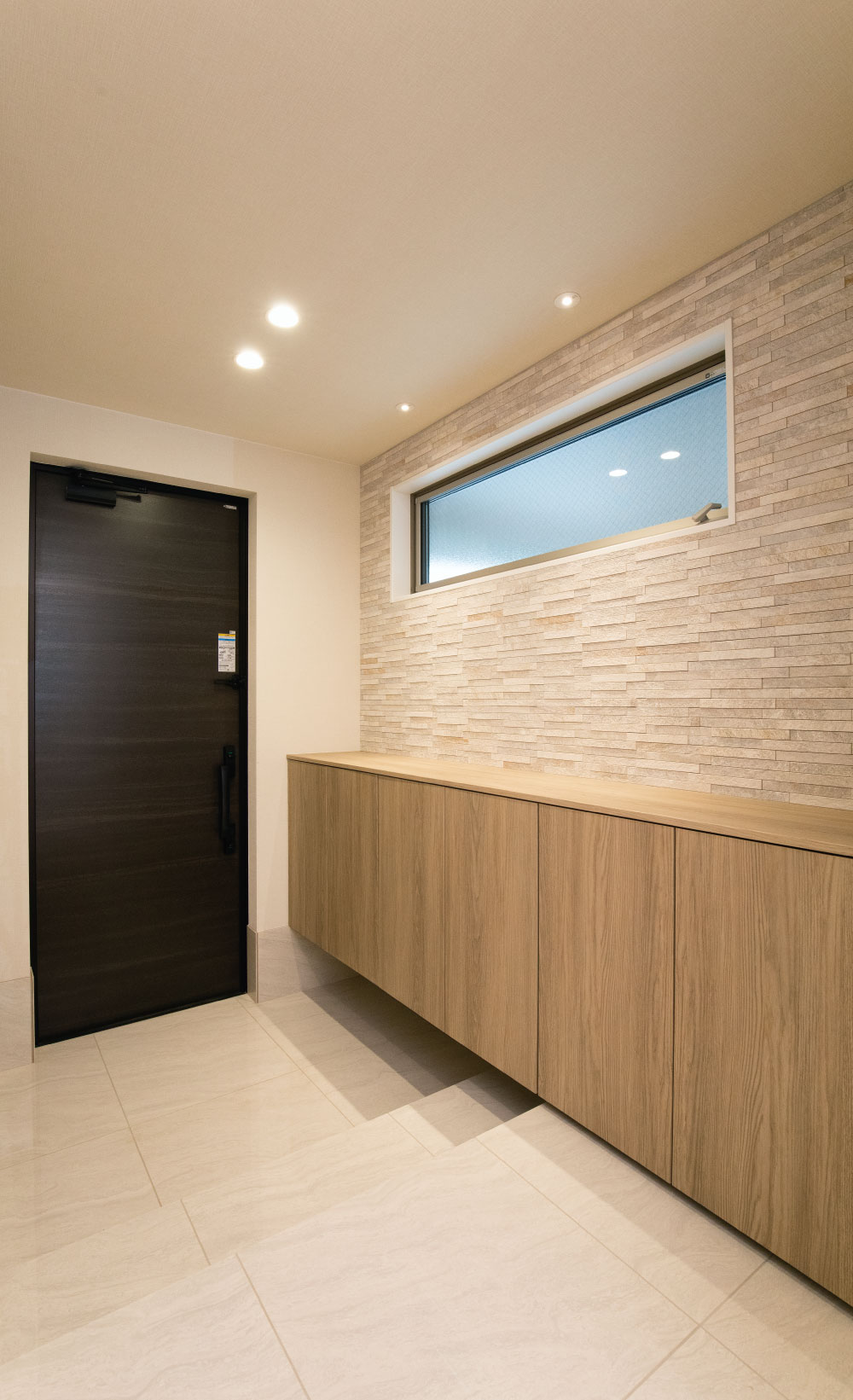 - 洗練された優美な空間を醸し出す、光沢のある600mm角の大判鏡面タイルを玄関、1階廊下の床仕上に採用。(※カラーや柄はコーディネートタイプにより異ります)