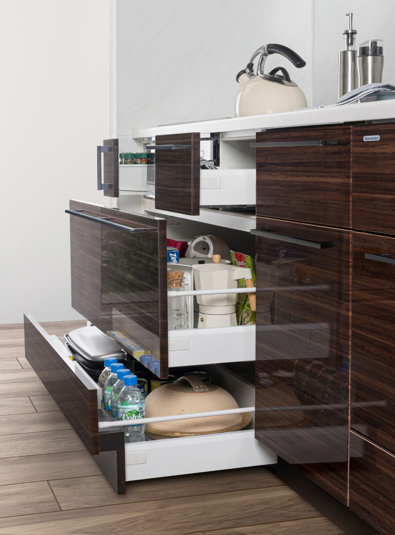 - キッチンの足元をスライド式で軽く引き出せるので、重い物も安全に収納できます。