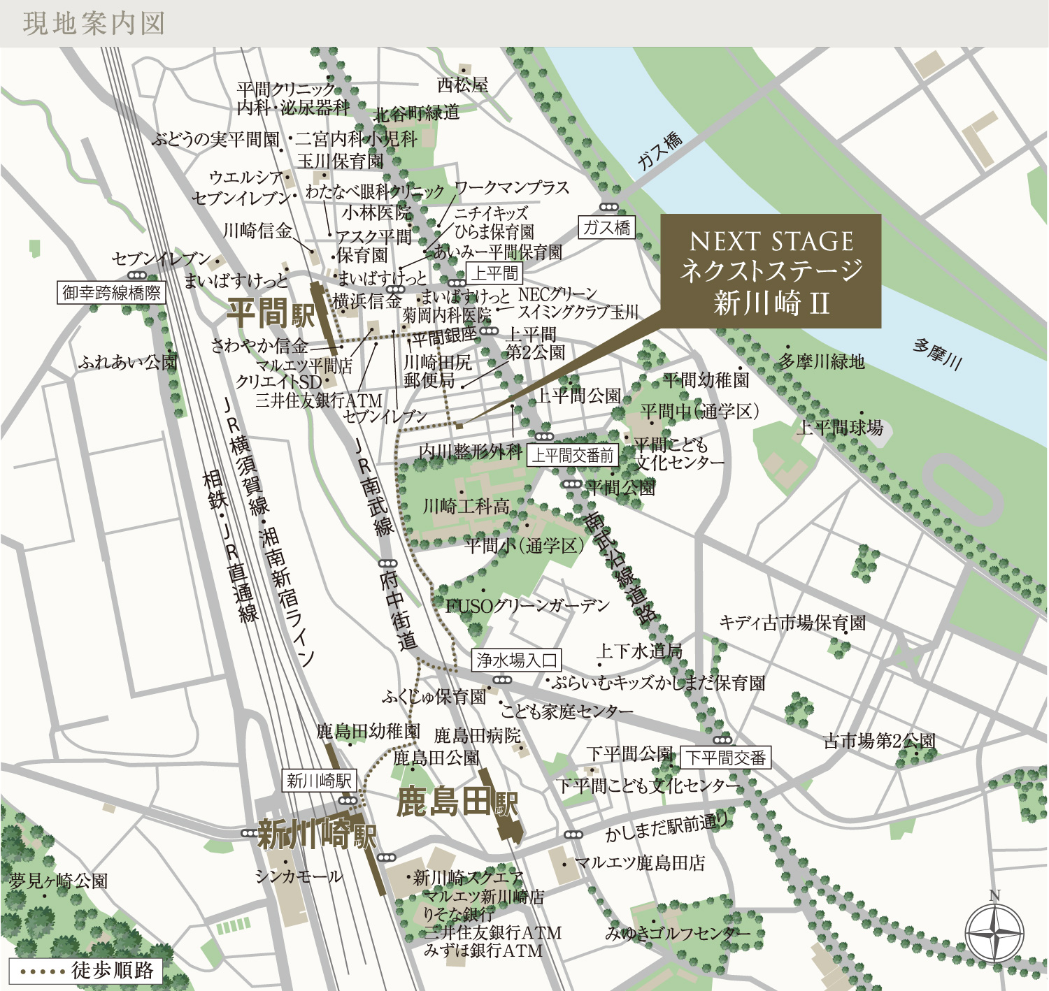 - JR南武線「平間」駅徒歩約7分、JR横須賀線・湘南新宿ライン「新川崎」駅徒歩14分