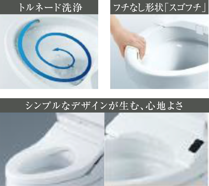 - 便器には表面がツルツルで汚れがつきにくいセフィオンテクトを採用。少ない水で効率良く洗う「トルネード洗浄」、フチなし形状「スゴフチ」がお掃除のしやすさを究めました。