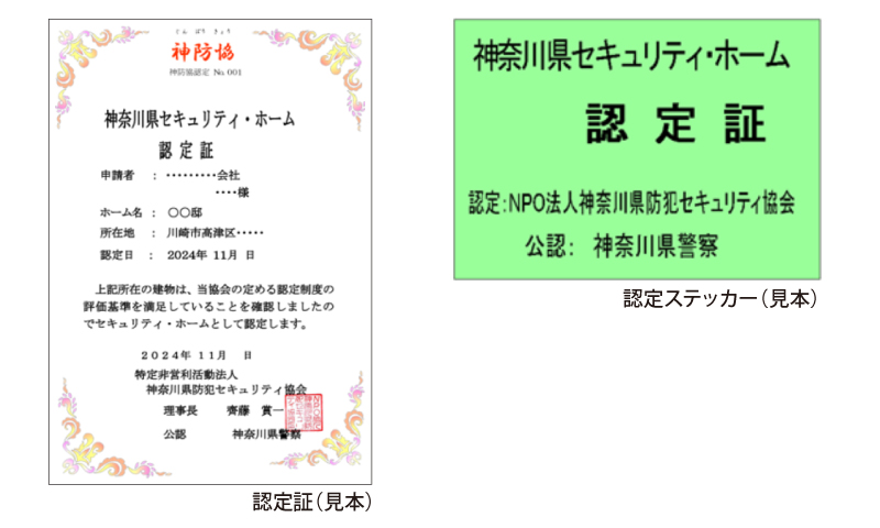 - 認定されると認定証と認定ステッカーが神奈川県防犯セキュリティ協会から配布されます。